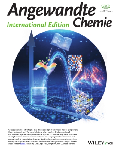 相关工作以“Accelerating Catalyst Materials Discovery With Large Artificial Intelligence Models”为题发表在国际顶刊《Angewandte Chemie International Edition》(中科院一区,IF=16.9)上, 并获选为Angew 封面。