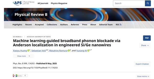 近日,必赢贵宾会3003官网微纳器件与材料物理团队在低维材料结构设计方面取得重要研究进展,相关研究成果以必赢贵宾会3003官网为第一单位,以“Machine learning-guided broadband phonon blockade via Anderson localization in engineered Si/Ge nanowires”为题,发表在物理学领域权威期刊《Physical Review B》上,该论文第一作者为2022级博士研究生黄晓宇,通讯作者为必赢贵宾会3003官网倪宇翔教授。