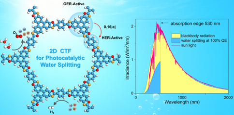 二维共价有机框架(COF)因其高度可调的分子结构、优异的稳定性及可设计的电子性质,被视为新一代无金属光催化材料的理想候选。该研究以对苯二甲醛(TPA)和三羟三氨基三苯(TTTP)为基本构筑单元,提出了通过分子层内精确构筑双功能活性位点的二维共价三嗪框架(2D CTF)设计策略,实现了HER 活性连接体与 OER 活性节点的周期性共嵌,从而在分子尺度上诱导电荷密度的空间分离与定向迁移,显著提升了光生载流子的分离效率与反应选择性。该研究展示了一种可在单一结构中实现双反应功能集成的设计范式,为构筑高效稳定的无金属全光解水体系提供了重要理论依据与方向。