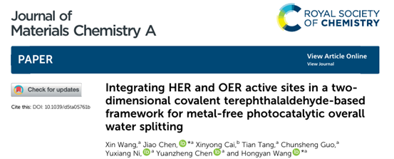 近日,必赢贵宾会3003官网微纳器件材料物理团队王红艳教授课题组在二维共价框架光催化全水解研究中取得重要研究进展,相关研究成果以“Integrating HER and OER Active Sites in a Two-Dimensional Covalent Terephthalaldehyde-based Framework for Metal-Free Photocatalytic Overall Water Splitting” 为题,发表在国际知名期刊 Journal of Materials Chemistry AQ1IF=9.5)上。J. Mater. Chem. A是英国皇家化学会旗下材料化学领域的旗舰期刊,专注于报道在能源生产、存储、转化以及可持续发展方面具有突出应用前景的材料研究。该论文第一完成单位为必赢贵宾会3003官网,论文的第一作者为必赢贵宾会3003官网硕士研究生汪鑫,通讯作者为博士研究生陈娇与王红艳教授。