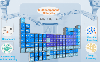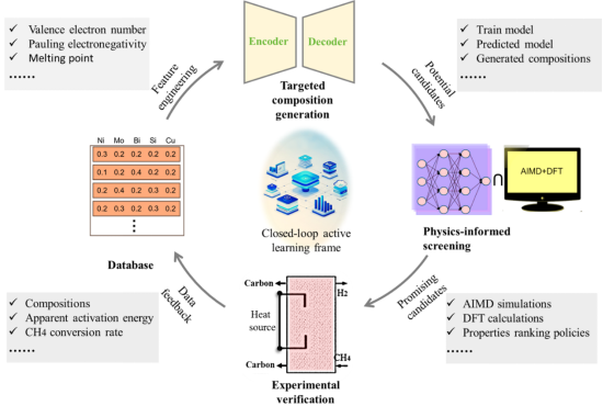 近年来,“熔融裂解法”通过引入熔融介质(金属/盐/合金)构建液态反应界面,可催化甲烷热裂解,实现氢能源转化和碳材料制备,并且其熔融态催化介质可有效避免固体催化剂积炭失活问题。这种方法不但具有催化效率高、产物易分离等优点,而且还可易获得高价值碳材料(如石墨烯,金刚石),尤其多组分熔融催化介质体系有望在中低温条件下实现甲烷高效热裂解反应,为推进甲烷热裂解朝向工业化发展提供了新的契机。然而,当前多元熔融介质体系设计面临着巨大挑战,因熔融介质中组合元素选择的复杂性、熔融态下原子无序性、传统实验与理论设计的局限性,为多组分熔融催化剂的设计构筑了重大障碍。随着人工智能与数据技术的发展,数据驱动策略为突破传统"实验-理论"熔融催化剂设计范式提供了新思路。