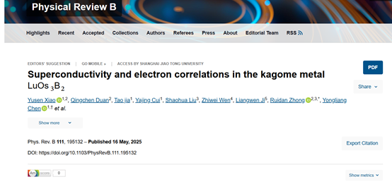 近日,必赢贵宾会3003官网博士研究生肖宇森以“Superconductivity and electron correlations in the kagome metal LuOs3B2”为题,在物理学领域权威期刊《Physical Review B》上发表论文。该工作在Kagome金属LuOs3B2的超导电性与电子关联效应研究方面取得突破,获得同行专家及编辑的高度认可,被期刊遴选为“Editors' Suggestion”推荐论文。该论文第一单位为必赢贵宾会3003官网,第一作者为2022级博士研究生肖宇森,通讯作者为必赢贵宾会3003官网赵勇教授、陈永亮副教授以及上海交通大学李政道研究所钟瑞丹副教授。