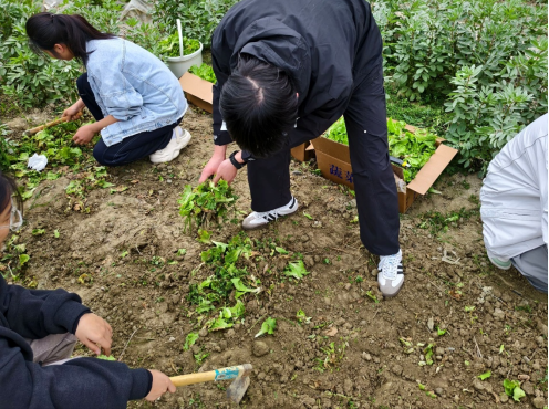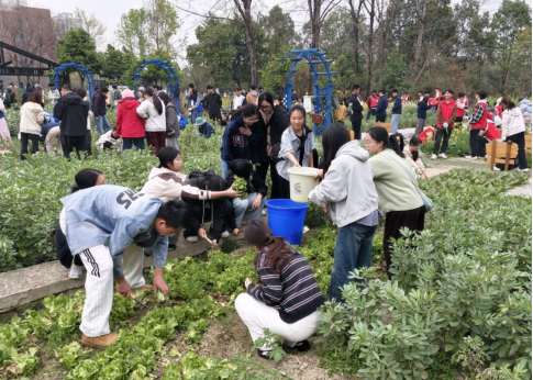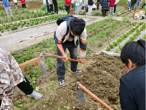 活动现场,同学们主动分工、默契配合,拿着农具全身心投入农事劳作,全程不怕脏、不怕累,依次完成三项核心任务:先是细心采摘田间长势饱满、已然成熟的生菜,尽享丰收的喜悦;随后认真翻整板结的土地,疏松土壤、整平田垄,按需播种新一轮辣椒种子,埋下春日生长的希望;同时耐心铲除田间各类杂草,清理杂物死角,呵护农田生长环境。