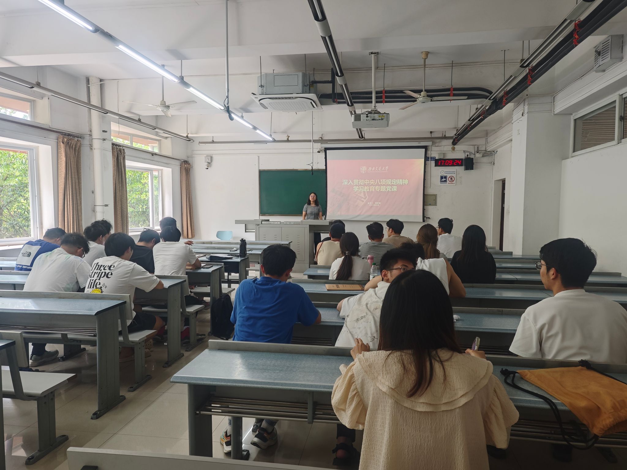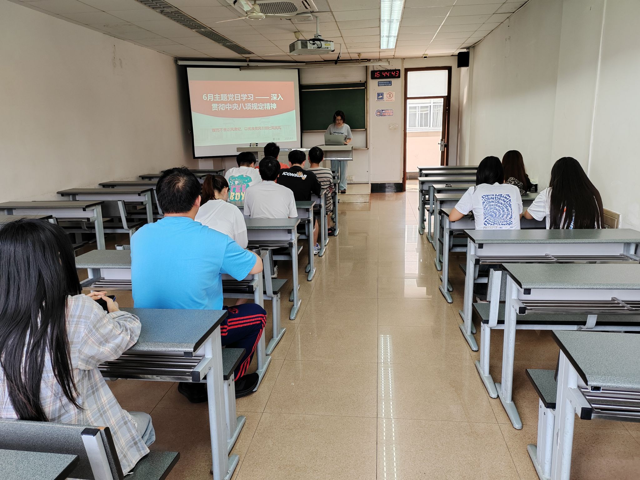 在党支部书记讲党课环节,各党支部书记围绕学习领会和贯彻执行中央八项规定及其实施细则精神,联系思想和工作实际,结合支部特色,为支部党员讲授党课。在党员集中学习以及警示教育环节,与会党员集体学习了《党的十八大以来深入贯彻中央八项规定精神的成效和经验》《八项规定改变中国》《违反中央八项规定及其实施细则精神典型案例》《党政机关厉行节约反对浪费条例》。同时结合河南省信阳市罗山县委原常委、政法委原书记李献林,信阳市委政法委原常务副书记叶金广等10名干部在学习教育期间违规吃喝、严重违反中央八项规定精神问题、河北省三河市在城市管理中违反中央八项规定精神、侵害群众利益问题两个典型案例,开展了警示教育在党员集中研讨环节,各学生党支部分别围绕学风考风、学术诚信,结合学习与科研的实际谈感想、谈认识,交流了学习体会。
