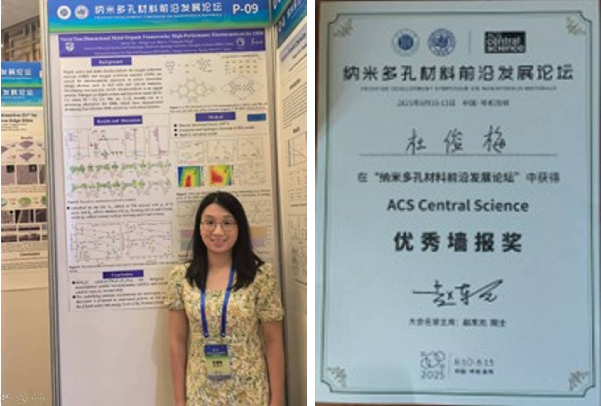 为促进学术交流,激励青年科研人员,论坛特别设立了优秀墙报评选活动。经专家评审委员会严格遴选,最终从众多参评作品中评选出9篇优秀墙报。其中,必赢官网王红艳教授课题组博士生杜俊梅的研究成果 Novel Two-Dimensional Metal Organic Frameworks: High-Performance Electrocatalysts for ORR 凭借其创新性和学术价值脱颖而出,荣获大会优秀墙报奖。